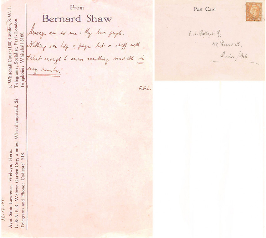 1. George Bernard Shaw. c26 word autograph note(seemingly in the handwriting of Shaw) on a personalised pink postcard, hand addressed by the writer and stamped. The printed postcard bears Shaw's two addresses - at Ayot St. Lawrence and his London address in Whitehall and states: From Bernard Shaw. It is hand dated 16.12.46. The note reads: .Messages are no use: they bore people. Nothing can help a paper but a staff with talent enough to ensure something readable in every number. This note is followed by the initials T.E.L. - the significance of which I have been unable to establish. The note is not signed - I have compared the handwriting on this card to other examples of Shaw's handwriting and offer it in the belief that it is his.