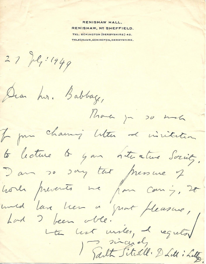 4. Edith Sitwell. c40 word autograph letter signed on a Renishaw Hall letterhead dated 27 July: 1949, declining an invitation to lecture to the Literature Society.