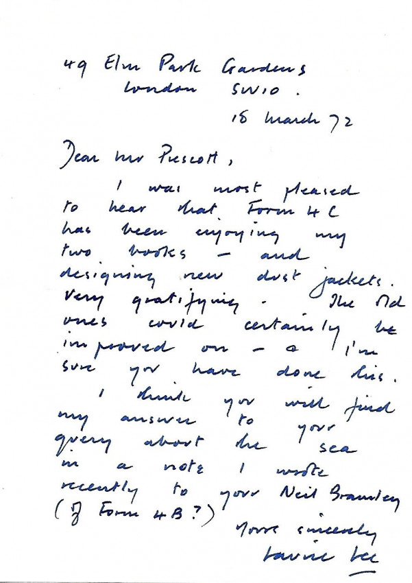 6. Laurie Lee. Nice circa 80 word autograph letter signed and dated 18 March 72, to a school master re his class having enjoyed Lee's two books (presumably Cider With Rosie and As I Walked Out One Midsummer Morning) and their project to design new dustwrappers for these books.
