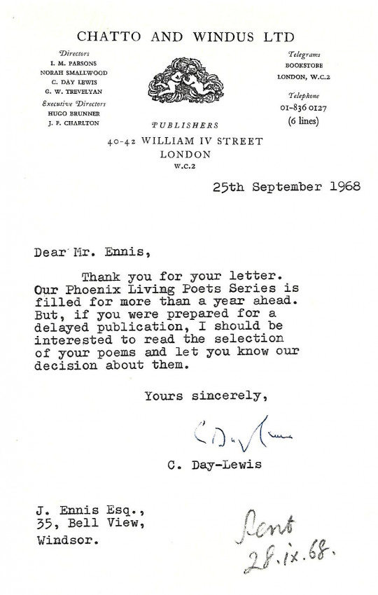 5. C. Day-Lewis. Short typed letter signed on a Chatto & Windus letterhead, dated 25th. September 1968, regarding possible contributions to the Our Phoenix Living Poet Series.