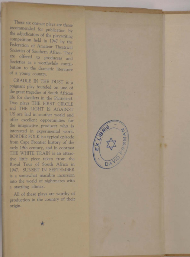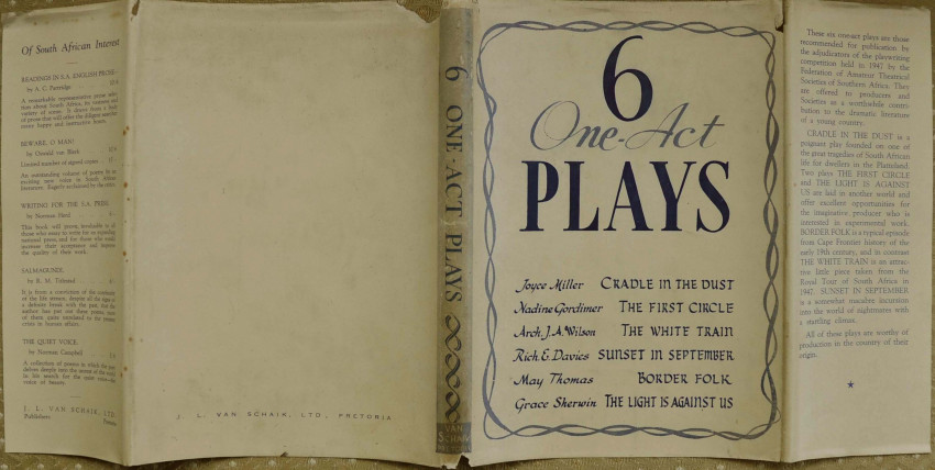 This is by far and away the scarcest Gordimer book, particularly so in the dustwrapper which is seldom encountered. It was published in 1949, the same year as "Face to Face", her first solo book and is arguably her first appearance in book form. Her contribution is the 28pp. play "The First Circle". Missing from most Gordimer collections. Other contributors include Joyce Miller, Arch. J.A. Wison, Rich Davies, Mary Thomas and Grace Sherwin.