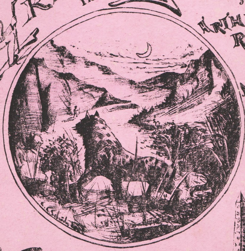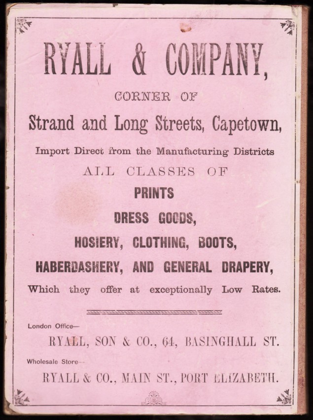 A South African Bibliography, volume 4, page 83, ‘The book is advertised for sale in Lantern, Jan. 29, 1887, page 10. The South African Library Copy has some figures in pencil in the top left-hand corner: “484 20/12/86”. Some of the illustrations appear to be by W.R. Schöder (the illustration on the cover is signed by him) and others are signed A.D.M (A.D. Menzies?
