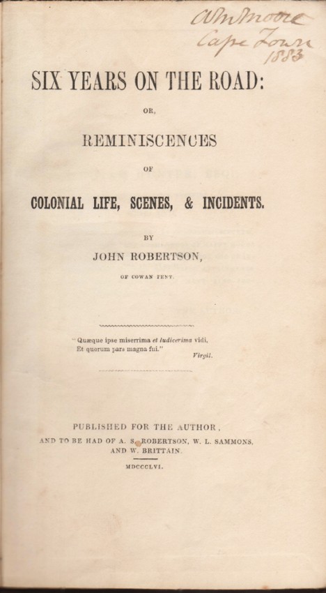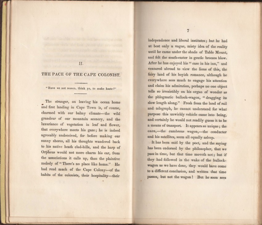 Mendelssohn (Sidney) South African Bibliography, volume 2, page 234, ‘A curious little collection of essays, written in Cape Town about the middle of the nineteenth century and mainly illustrative of that town and its suburbs at that period. One of the chapters deals with the state of the Cape Town Library, drawing attention to the lack of a proper catalogue, and criticising the selection of new books acquired from time to time.’