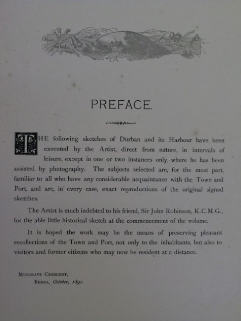 \"To His Excellency Sir Charles B.H.Mitchell, K.C.M.G., Governor of Natal (South Africa) The following Collection of Sketches of Durban and its Harbour, is respectfully dedicated by The Artist.\"