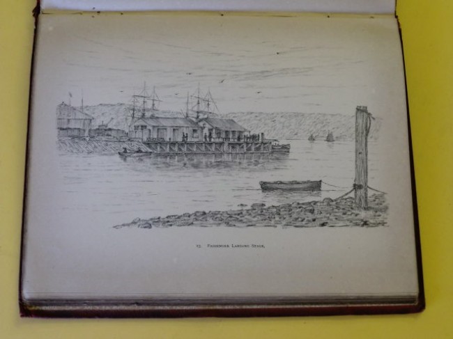 Original red boards with gilt title on front cover. The boards are in rather worn condition, with wear to spine ends and corners (some loss), corners bumped, dark discolouration of the boards due to handling, floral-patterned end-papers good, paper quality is poor, resulting in fading, and some gatherings are loose. All sketches are in good condition and are protected by a blank, thin protective page opposite (bound in). A very scarce item.