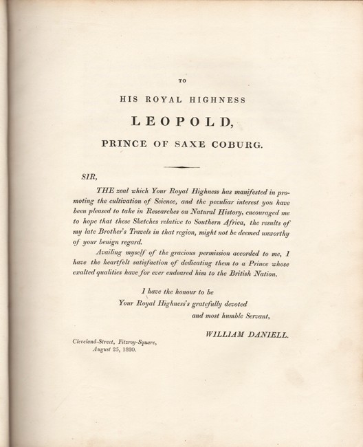 Abbey (J.R.) Travel in Aquatint and Lithography 1770-1860, number 326, 'The circumstances in which Samuel Daniell obtained the drawings from which these plates were made are briefly discussed in the Notes to Samuel Daniell's African Scenery and Animals, 1804-5. Samuel Daniell died in Ceylon in 1811. Of the choice of soft-ground etching for the reproduction of his brother's drawings William says, "He has merely to add with respect to the engravings, that he has endeavoured to transfuse into them the spirit of the originals by a process which appeared to him best calculated for the attainment of that object." It is a most beautiful and sensitive work. One can well believe that William had not intruded himself but has indeed kept "the spirit of the originals."' Daniell's sketches are now highly regarded as an early and sympathetic record of African life.
