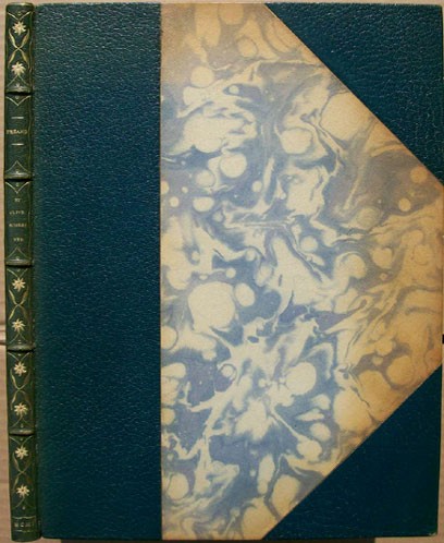 Original de luxe blue leather and marbled paper binding with gilt titling and decorations on the spine. The marbled paper covering the boards is repeated with the end papers. The are a preliminary eight leaves (16 pages), the text numbered to page 82, followed by a further five leaves ( 10 pages) one of which has the colophon.