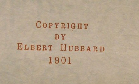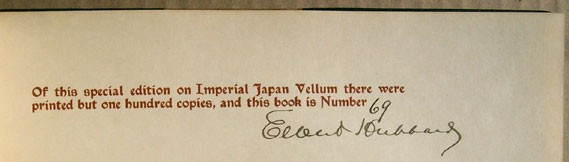 Copy Number 69 of an edition limited to 100 copies. The statement of limitation is signed by Elbert Hubbard. The binding is stamp signed in gilt with the word "Roycroft".