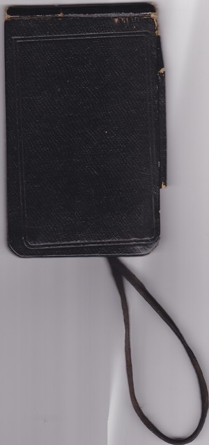 Notebook with black cloth-covered boards and empty pencil-holder. Black cloth cord.