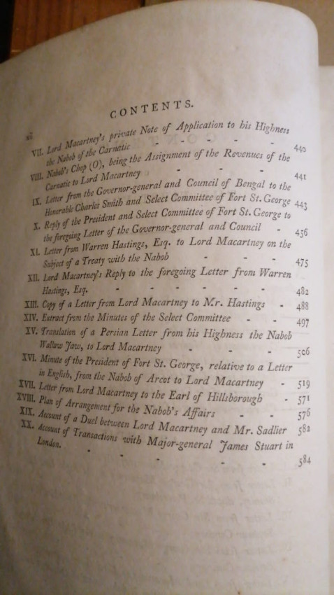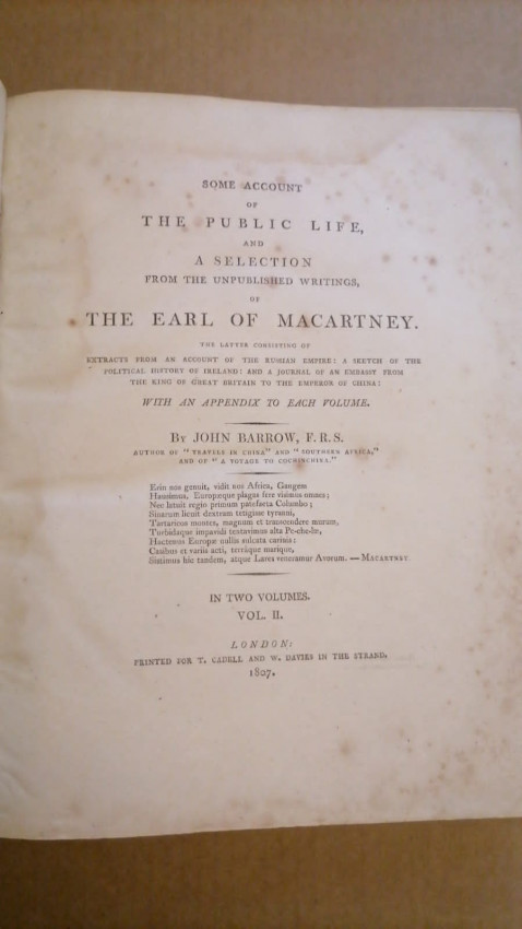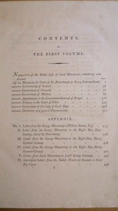 George Macartney (1737-1806) had a long and distinguished political and diplomatic career. He held the post of Secretary for Ireland, was successively governor of Grenada, Madras and the Cape Colony, and served as trade envoy to Russia and China. The son of an Irish landowner, Macartney rose in his profession through diligent diplomacy, perseverance, ambition and integrity; he gradually advanced in both the British and Irish peerage. This two-volume biography by Sir John Barrow, who had accompanied Macartney to China and the Cape, was first published in 1807, and draws heavily on official documents from Macartney's periods in office. Volume 1 contains a chronological account of Macartney's professional life, focusing particularly on the challenges he faced while Governor of Madras in the 1780s, including military threats, wrangling over fiscal policies, the extension of Fort St George, and plans for a Madras police force. (Google Books)