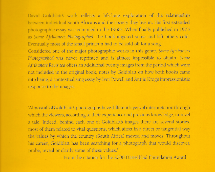 With essays by Antjie Krog and Ivor Powell. Laminated stiff paper wrappers, 235 pages, illustrated with black and white photographs. William Kentridge designed book plate on first title page. Spine lightly sunned, notes in pencil by previous owner on inside front and first title page.