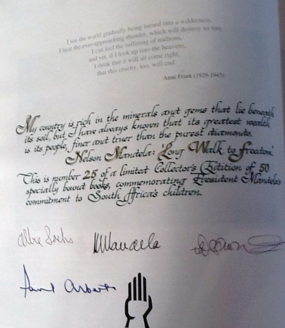 Limited to 50 specially bound books commemorating Nelson Mandela's commmitment to children. Signed on facing title page by Mandela, Archbishop Desmond Tutu, Albie Sachs and Paul Alberts (the photographer). Signatures also next to each chapter title.