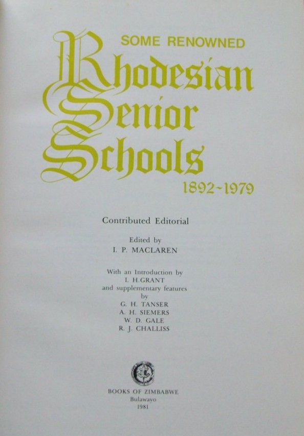 Some Renowned Rhodesian Senior Schools 1892-1979: Contributed Editorial - Edited by I.P.MacLaren. With an Introduction by I.H.Grant and supplementary features by G.H.Tanser, A.H. Siemers, W.D.Gale and R.J.Challiss.
