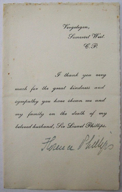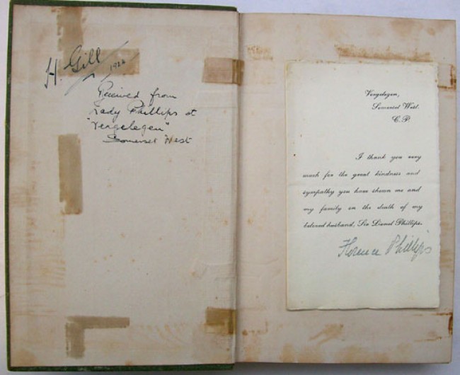 Loosely inserted is a note of thanks signed by Lady Phillips and a pen inscription on the front paste down stating that the book was received from her at "Vergelegen", Somerset West.