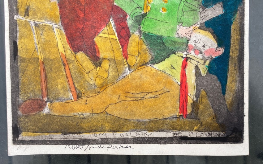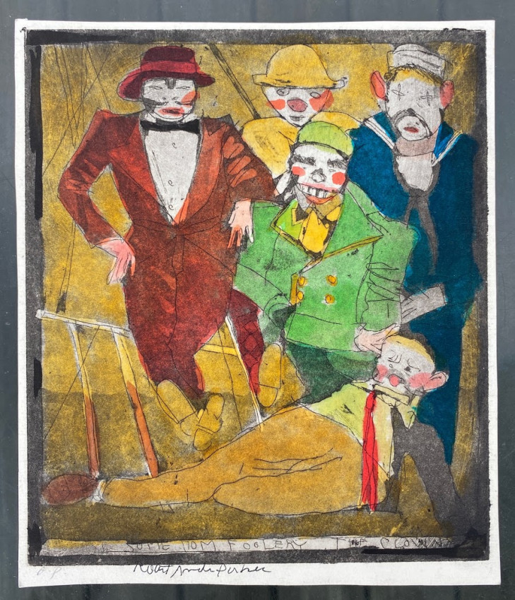 'Some Tom Foolery. The Clowns’, original artwork. [Undated]. Original aquatint, colored by hand by RAP, signed beneath the image. ‘A.[rtist’s] P.[roof]’ to the lower left corner. lower left margin, on wove paper (7 ¼ x 6 1/8in; 184 x 155mm), a New Yorker Magazine label to the verso.