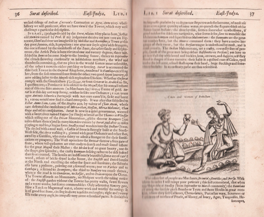 Herbert made the best of the experience by composing a narrative of the journey there and back with digressions on the various places and peoples he encountered. The voyage out began in Dover, sailed via the Canary Islands, Robben Island, around the Cape of Good Hope, stopped at Madagascar, Ethiopia, Goa, and Surat seeing Coryate's grave, eventually arriving at Gambrun [Bandar Abbas]. Herbert and the remaining English returned through India and again around the Cape. After his return, while waiting to assume his position at court Herbert wrote the first version of his travel narrative, A Description of the Persian Monarchy now beinge: the Oriental Indyes, lies and other parts of the greater Asia and Africk (1634). The book was an impressive folio with an engraved title page and thirty-five copperplate engravings and maps.