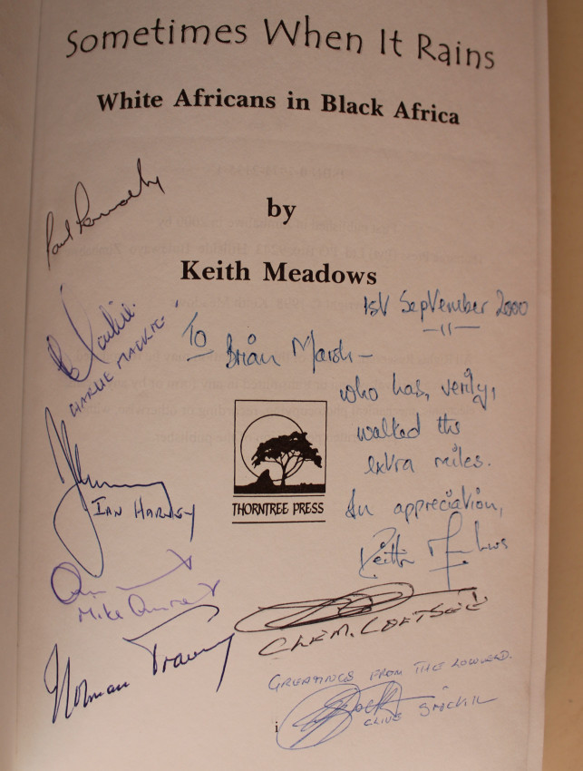 First edition 2000 bound in full leather in a matching slipcase. Imprinted on front: B MARSH. Red titled lables to the spine. Green end papers. Gifted on title page to hunter / author Brian Marsh, who has, verily, walked the extra mile, in appreciation - Keith Meadows. Also seven other signatures on title page. Clem Coetzee, Norman Travers, Charlie Mackie, Paul Connolly, Ian Harvey, Clive Stockil)