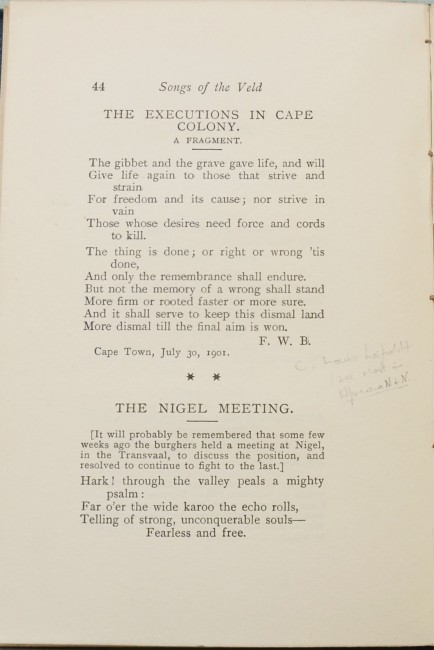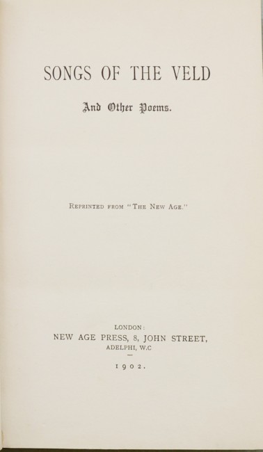 This first edition is an extremely rare volume of poems which first appeared in 'The New Age', a liberal and anticolonialist periodical, and published in book form in 1902. The poems leaked war time information about the atrocities committed by the British army on the civilian population, to the outside world. Those poems written by South Africans were anonymous to prevent prosecution under martial law. The South African contributors include C.Louis Leipoldt (his first published poem), Alice Greene, Betty Molteno, Anna Purcell, Dr. F.C.Kolbe and others. The book was published for the 304 subscribers listed in it, and there were probably not many more copies printed as the sentiments expressed in it were hated by the British and it was banned in South Africa. It is thus one of the very scarcest Boer War items in first edition. It is not in the Hackett Bibliography of South African War Books. It was republished in 2008 by Marthinus van Bart, jounalist for 'Die Burger'. The reprint is done beautifully with a well researched commentary on the background to the book and it's various contributors. Van Bart located 2 copies of the first edition in the archives of UCT and Stellenbosch University (the latter used for the reprint) but was unable to find one in the private sector. This copy is bound in two tone leather and is in very nice condition. The front hinge is slightly cracked but firm and there are a few very neat small pencil annotations mainly to identify the poets. A most desirable item.