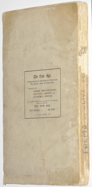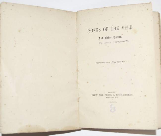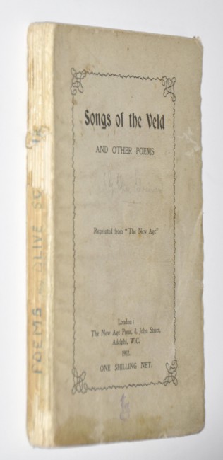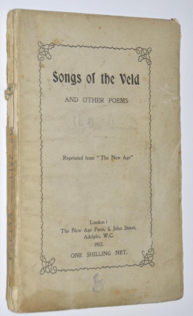 This first edition is an extremely rare volume of poems which first appeared in 'The New Age', a liberal and anticolonialist periodical, and which was then published in book form in 1902. At one time it was thought to be by Olive Schreiner and it is indeed included in Mendelsohn's South African Bibliography as such. Subsequently only one of the poems, Scheepers, was attributed to her, but was in fact by her friend Betty Molteno. Somehow the association has persisted and the book is still considered by some as an ""Olive Schreiner item"". The poems leaked war time information about the atrocities committed by the British army on the civilian population, to the outside world. Those poems written by South Africans were anonymous to prevent prosecution under martial law. The South African contributors include C.Louis Leipoldt (his first published poem), Alice Greene, Betty Molteno, Anna Purcell, Dr. F.C.Kolbe and others. The book was published for the 304 subscribers listed in it, and there were probably not many more copies printed as the sentiments expressed in it were hated by the British and it was banned in South Africa. It is thus one of the very scarcest Boer War items in first edition. It is not in the Hackett Bibliography of South African War Books. It is particularly scarce in the original wrappers. It was republished in 2008 by Marthinus van Bart, a jounalist for 'Die Burger'. The reprint is done beautifully with a 160pp. well researched commentary on the background to the book and it's various contributors. Van Bart located 2 copies of the first edition in the archives of UCT and Stellenbosch University (the latter used for the reprint) but was unable to find one in the private sector.