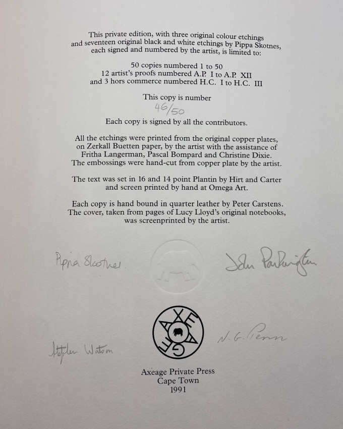 Hand numbered (46/50) and signed by the authors in pencil on the colophon page. Contains 3 original colour etchings and 17 original black and white etchings by Pippa Skotnes, each signed and numbered by the artist. The pictorial, paper coverings of the boards are taken from Lucy Lloyd's manuscript notebooks.
