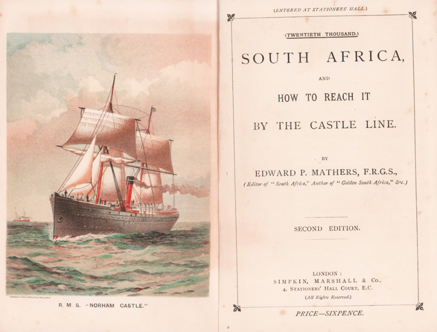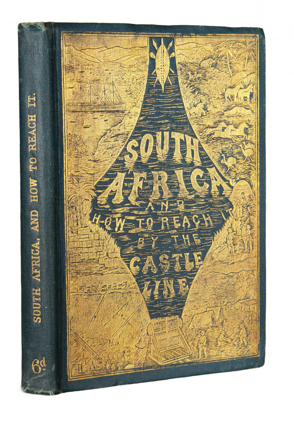 Second edition: 204 pages, colour frontispiece of R.M.S. Norham Castle under steam and sail, folding colour map 12 plates, elaborately gilt decorated upper cover and with a gilt map of Africa on the back cover, starting to wear at the hinges, a good copy