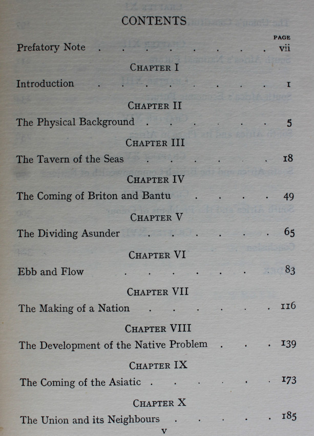 Chapters on: Tavern of the Seas. Coming of Briton and Bantu. The Dividing Asunder. Making of a Nation. Development of the Native Problem. Coming of the Asiatic. The Union and its Neighbours. The Union's Constitution. South Africa and the Problems of Colour....