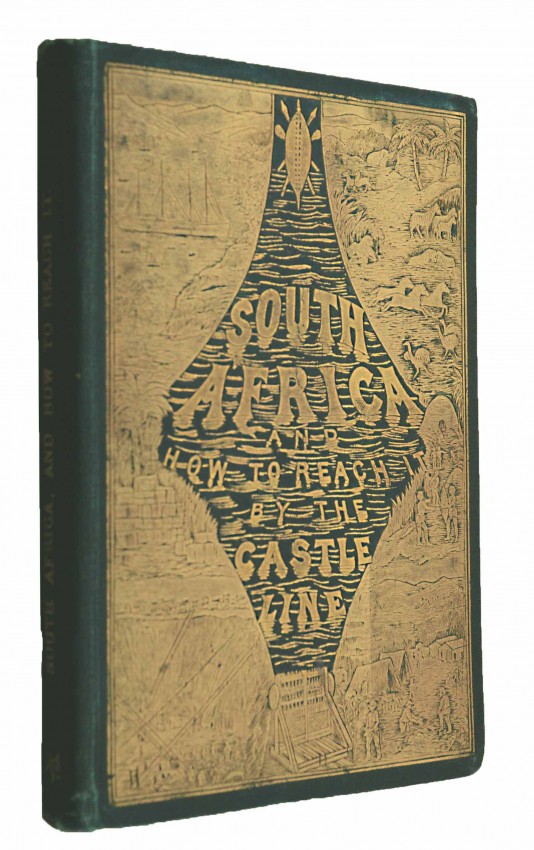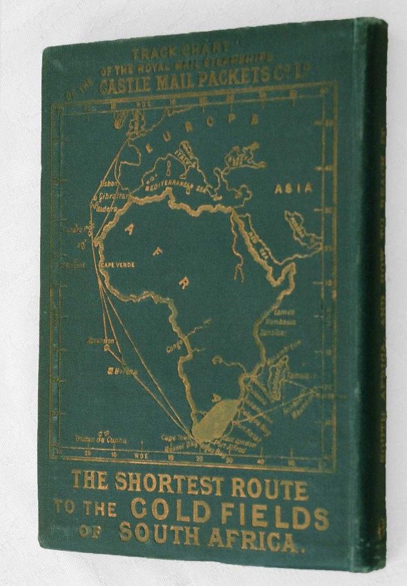 Bound in green limp cloth with wonderful detailed illustrated decoration in gilt including a map of Africa on the rear cover which states "The Shortest Route to the Gold Fields of South Africa". Minimal offsetting the the endpapers, otherwise a just about fine copy of the is book in original state and presumably very scarce thus.