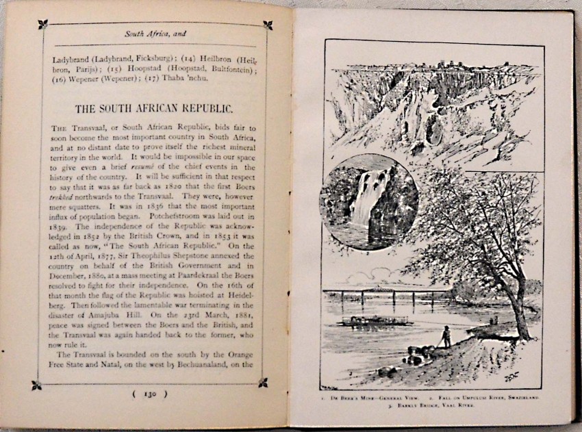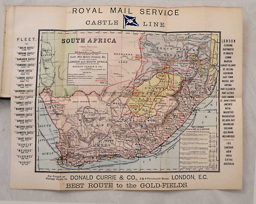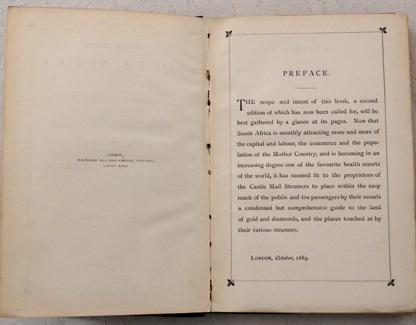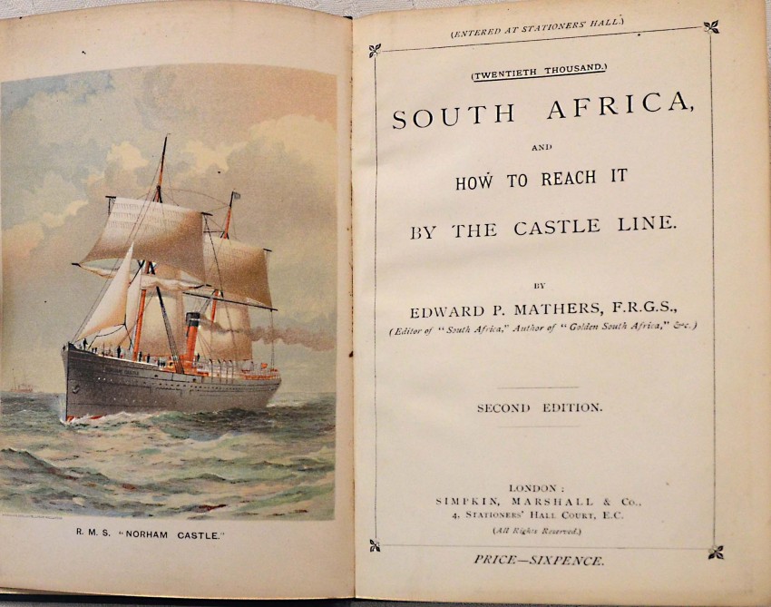 An unusually about fine copy of this attractive 204pp. booklet detailing the sea voyage to the Cape and with much information (statistical and general) about the South Africa of 1899 including the Gold Fields. With several attractive black and white illustrations and a coloured frontispiece of the Norham Castle and a large coloured folding map of South Africa. The second edition ((Twentieth Thousand).