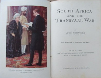 Volume V. From the Disaster at Koorn Spruit to Lord Roberts' entry into Pretoria. Half Title. Coloured Frontispiece. Title. Contents - Vol.V. List of Illustrations - Vol.V. Chronological Table - Vol.V. Map. viii plus 199 pages text & Appendix.