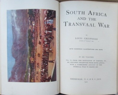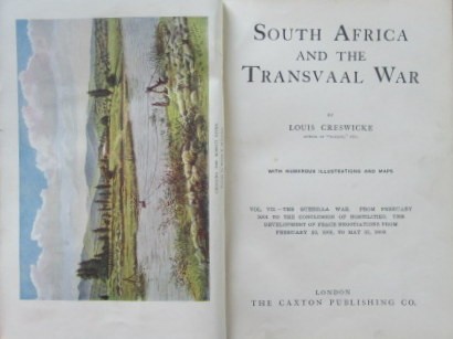 Volume VI. From the occupation of Pretoria to Mr.Kruger's departure from South Africa, with a summarised account of the Guerilla War to March 1901. Half Title. Coloured Frontispiece. Title. Contents - Vol.VI. List of Illustrations - Vol.VI. Chronological Table - Vol. VI. Table of Casualties. vii plus 216 pages text.