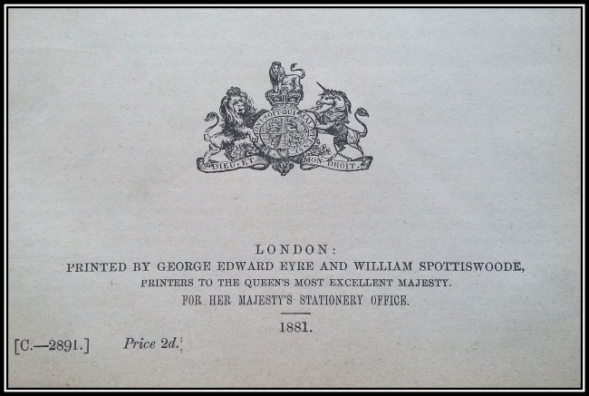 London: Printed by George Edward Eyre and William Spottiswoode, printers to the Queen's Most Excellent Majesty. For Her Majesty's Stationery Office, 1881; British Parliamentary Paper C. 2891; Paper wrappers; Collation complete - 15 pages; A clean copy.