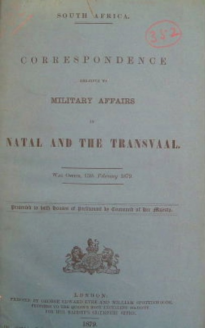 \"South Africa. Correspondence relative to military affairs in Natal and the Transvaal. War Office, 13th February 1879.\" Folio. Blue printer wrappers. Pp. (iv),42, 2 folding maps. A very important Blue Book [C.-2234], with official correspondence by among others Sir Bartle Frere & Lord Chelmsford concerning events in Zululand and eastern Transvaal (Sekukuni). Chelmsford was General Officer Commanding, Cape of Good Hope and had responsibility for the two seats of war. The correspondence about Zululand goes right up to 22 December 1878 and concerns troop raising & movements, costs of transport, activities on the Zululand border, etc.. The one large folding map shows Natal & Zululand, with distances, the other is an attractive map of the area north of Lydenburg. Orginal blue printer wrappers, bound into cloth covers. Covers a bit rubbed, red number on upper-wrapper, some small margin tears. Good condition
