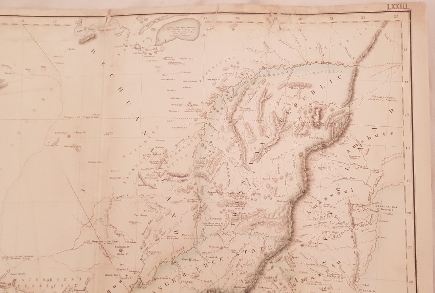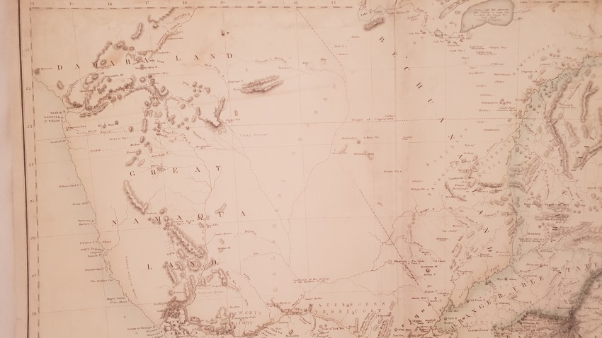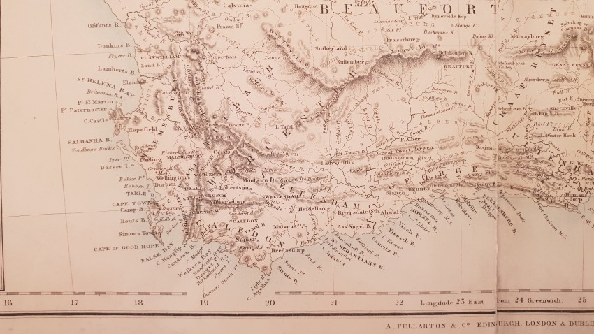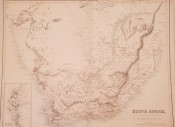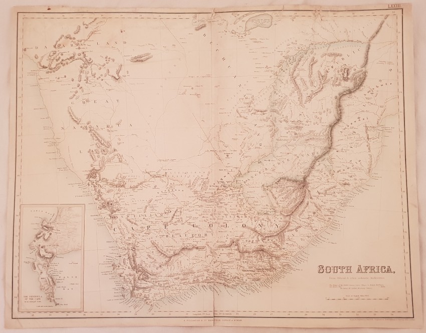 Very beautiful map of South Africa, coloured by hand, big size. One detailed enlargement of the Peninsula of the Cape.
