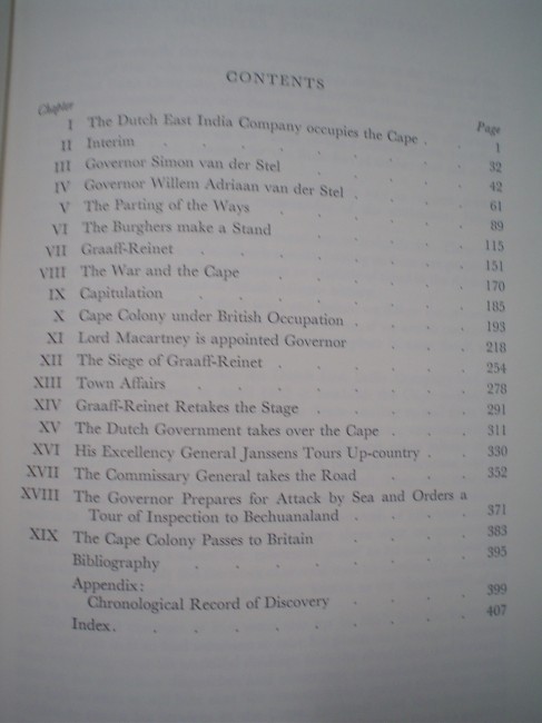 The author attempts a presentation of the Afrikaner as the already ripened product of his circumstances before he became a British colonist in 1806. Chapters on the Governors Van der Stel, Graaff-Reinet, the War and the Cape, Siege of Graaff-Reinet, Janssens tour, Cape Colony passes to Britain. 422 pages, index, bibliography, appendix, chronological record of discovery, fold-out map.
