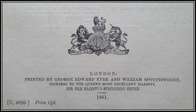 London: Printed by George Edward Eyre and William Spottiswoode, printers to the Queen's Most Excellent Majesty. For Her Majesty's Stationery Office, 1881; British Parliamentary Paper C. 2892; Paper wrappers; Collation complete - 11 pages; A very clean copy, with some age toning.