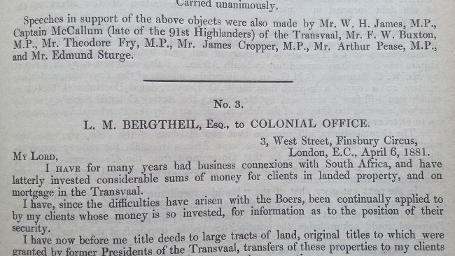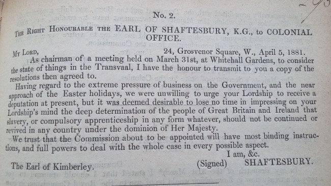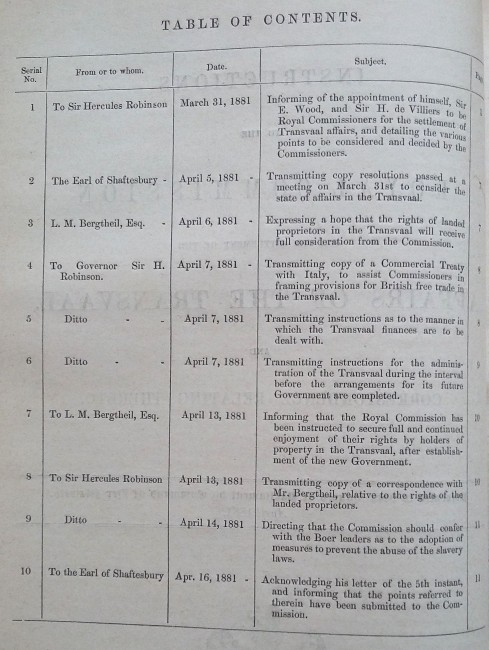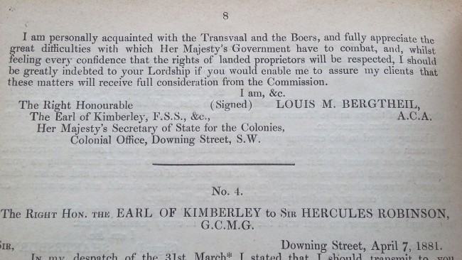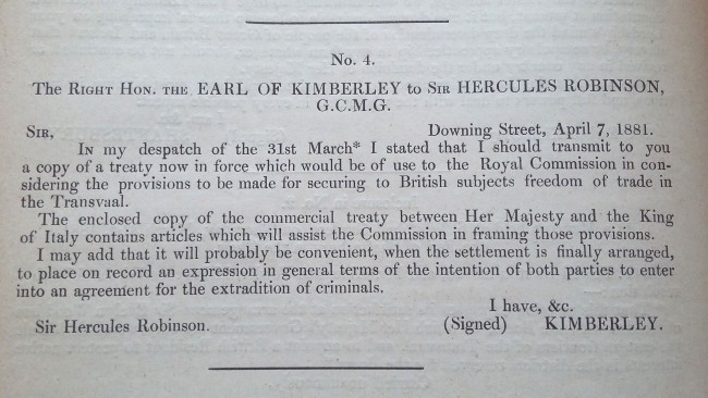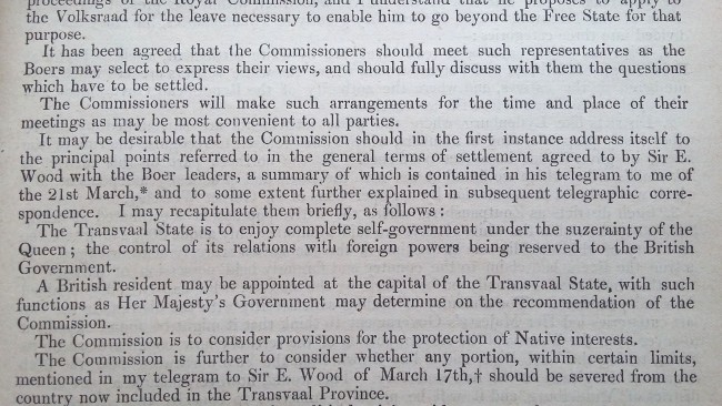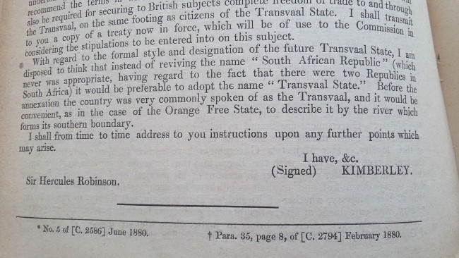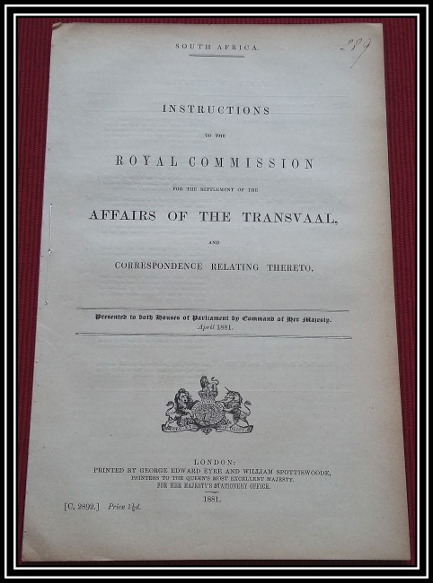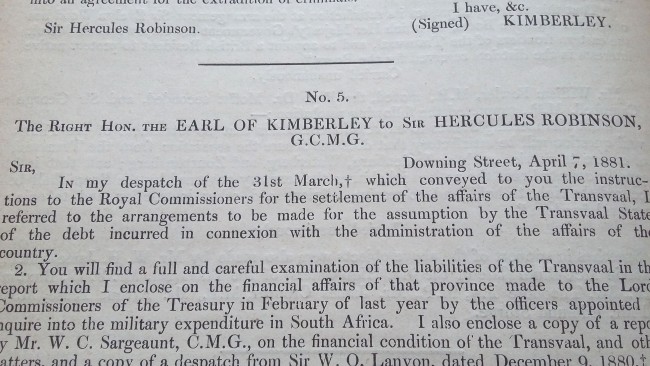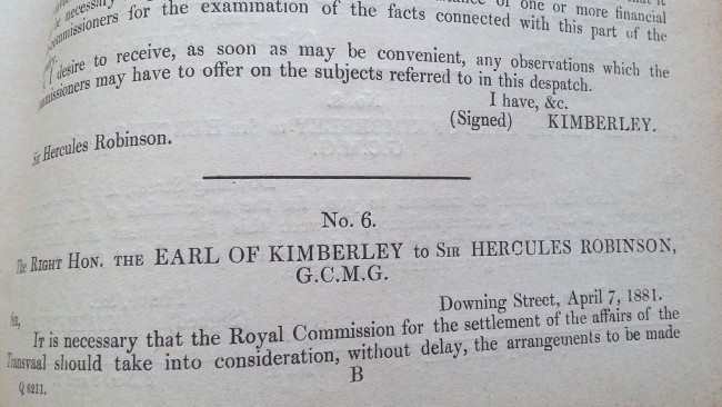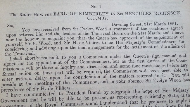 Following establishment of peace agreement at end of First Boer War Commission appointed to bring into effect changes in Transvaal government under British suzerainty. Much of correspondance between Lord Kimberley and Sir Hercules Robinson, G.C.M.G. Sought after document.