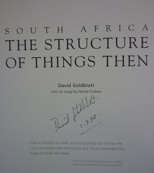 The Structure of Things Then is the culmination of 15 years of photography, consisting of 136 evocative black and white photos reflecting the relationships between the structures and forces that shaped south Africa between 1952 and 1990. Goldblatt refers to this period as "the era of Baaskap" or White domination. There is an "Extended Captions" section giving more detail of each photo and an Essay by Neville Dubow entitled Constructs: Reflections on a Thinking Eye. This copy is signed and dated by David Goldblatt.