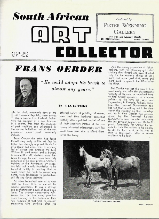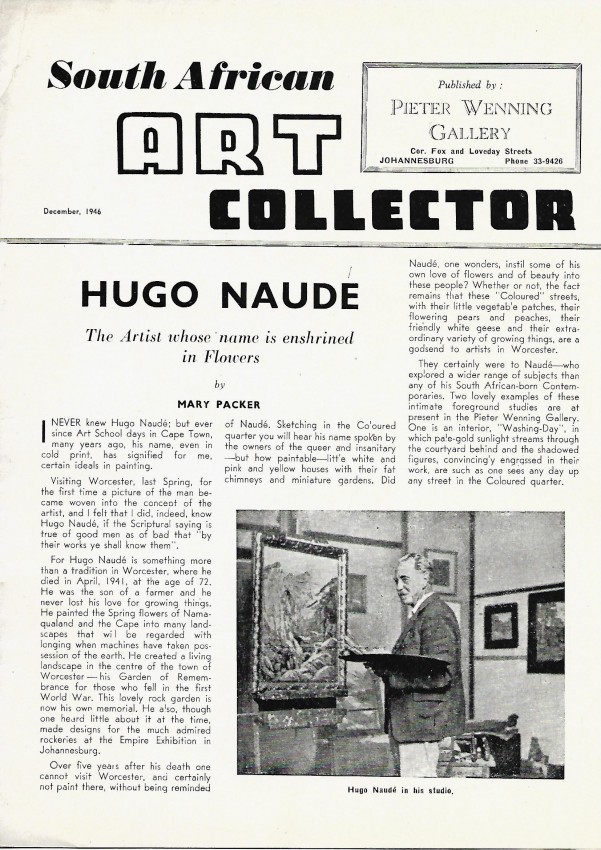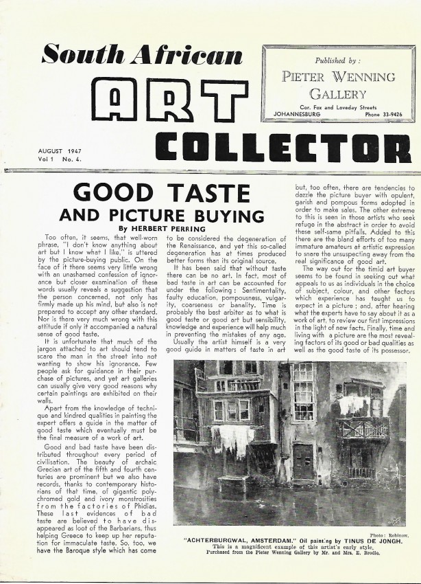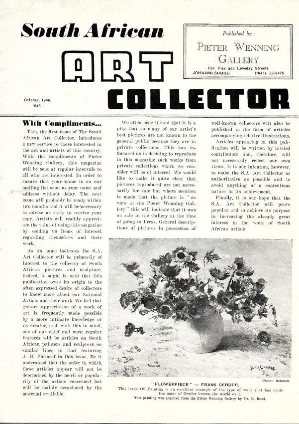 The first 4 issues of this very scarce early South African Art periodical published by the Pieter Wenning Gallery from October 1946 till August 1947. (Possibly all issued). Illustrated articles by various authors on Pierneef, Hugo Naude, Frans Oerder, Terence McCaw, J.H. Amschewitz and others. Each issue is 8pp. quarto size in glossy paper, stapled. In very good plus to near fine condition. Uncommon thus.