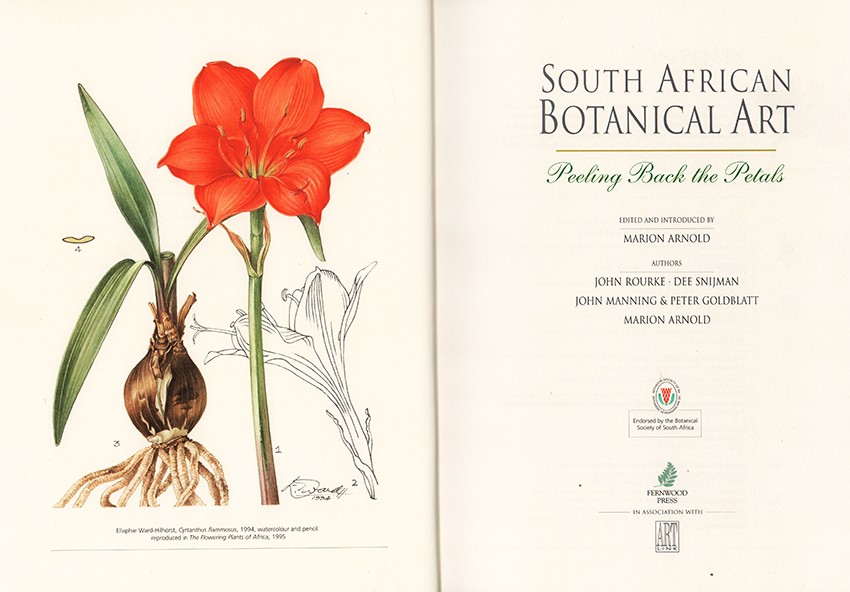 Editor’s note. ‘Remarkable images of plants created by the most talented of botanical artists, are housed in store rooms of botanical institutes and museums. Yet the oil paintings, etchings and watercolours of ‘fine’ artist – depicting the same plants – are located in art galleries. Why are plant portraits classified differently, and kept apart? Is plant imagery to do with science, or with art? Do the two ‘kinds’ of art ever meet? This unique and ground-breaking book metaphorically ‘peels back the petals’ to explore southern African plant portraiture and discovers the meanings ascribed to the genres of ‘botanical art’ and ‘flower painting’. Well known for their particular contributions to botany, art, and art history, authors Marion Arnold, Peter Goldblatt, John Manning, John Rourke and Dee Snijman examine plant portraiture in southern Africa over several centuries. They provide engrossing and sometimes unique revelations on a broad spectrum of issues, including species ‘discovery’, insect pollination, biological classification, specimen collection, plant naming, portraiture, and the manner and style of artistic representation. The texts are enhanced and liberally illustrated by works of some of the countless travellers, botanists an artists who have so passionately and meticulously recorded South Africa’s rich floral heritage.’
