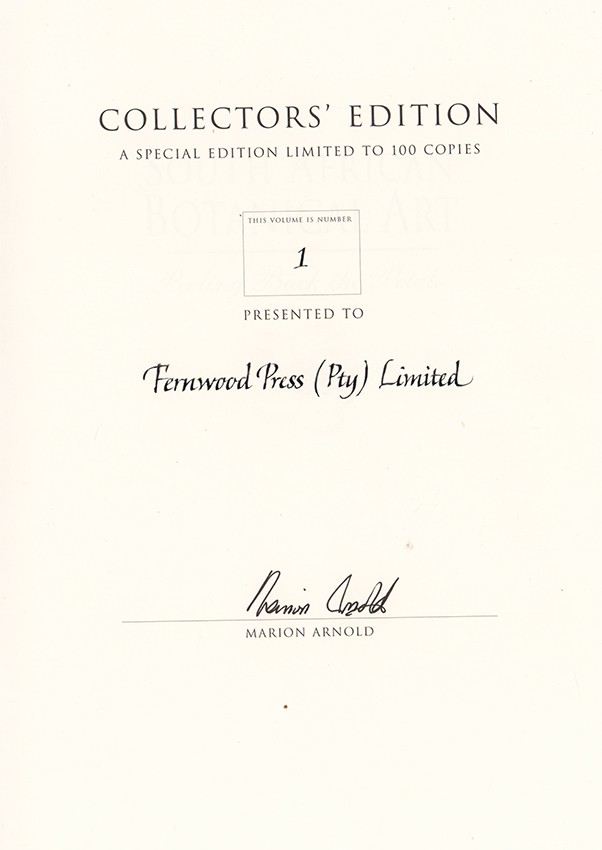 The limitations page reads: Collectors' Edition. A special edition limited to 100 copies. This volume is number 1 presented to Fernwood Press (Pty) Ltd signed by the author.