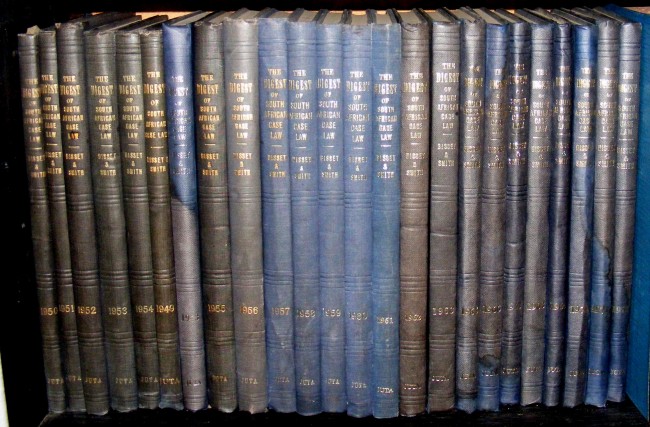 Bisset and Smith's Digest of South African Case Law containing the Reported Decisions of the Superior Courts, Juta, 24 volumes, volume for 1964 missing, 160 x 245 mm, some slight sun-fading to spines, condition: very good.