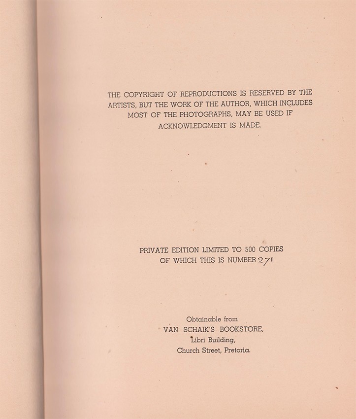 Loosely inserted is an essay Landscapes of the Soul - 8 pages - written by Abbé Henri Breuil to Walter Battiss on the occasion of the prehistoric art exhibition opened by Professor C.Van Riet Lowe at the Gainsborough Galleries Johannesburg on 24 October 1944.