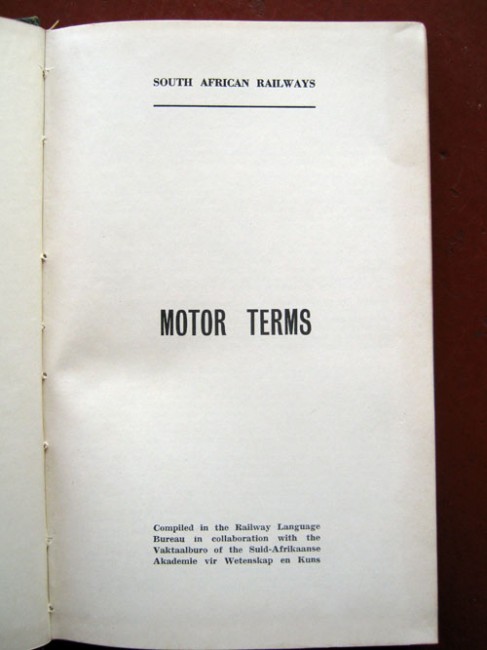Dictionary is split, one half from English to Afrikaans, and vice-versa. 233p. Green skivertex boards, black lettering. Previous owner\'s name on front paste-down endpaper. Spotting to edges.