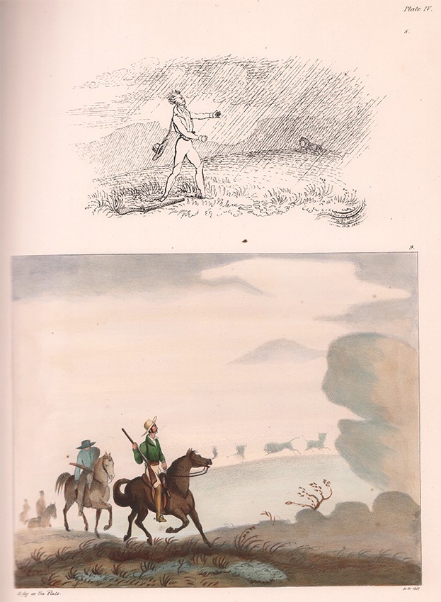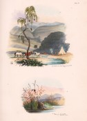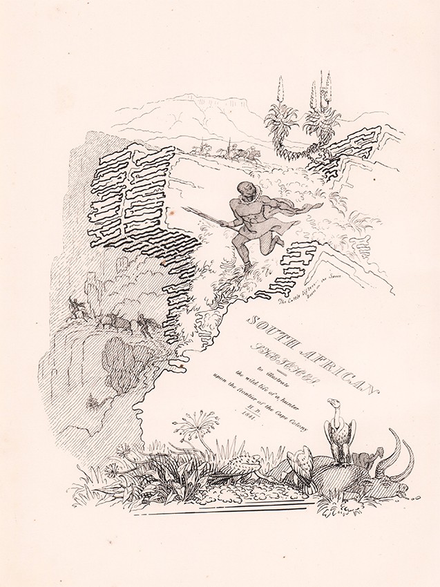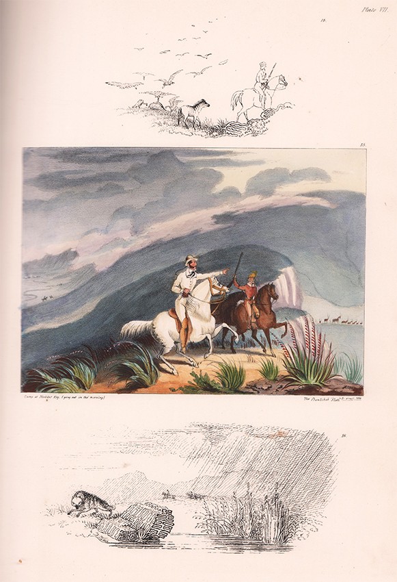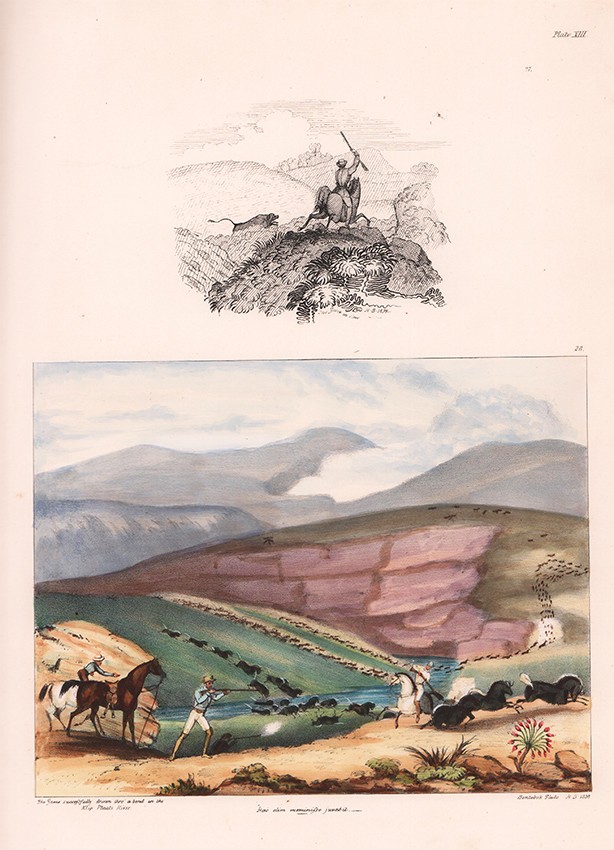 Mendelssohn (Sidney) South African Bibliography Volume 1, page 235: A rather scarce volume of hunting scenes in the Cape. The work is devoted to an illustrated description of sporting adventures on the “Bontebok Flats" in Kaffraria, near the Kat River Settlement, "at the extreme verge of the Cape Colony, and beneath the mountain ranges amongst whose fertile valley the Kat, a tributary of the Great Fish River, has its origin." The sketches were made "to relieve the dreariness of two years' residence upon a barbarian frontier," and they serve as an excellent record of the appearance of this part of South Africa during the first half of the nineteenth century. Many of them are described from extracts "from a journal written on the spot," which affords a capital account of the sport enjoyed in these districts, with some interesting notes on the political and military position of the country. The writer evidently did not hold with the views of the party who were in the habit of making excuses for the ravages of the Kaffirs, and of attacking the Boers for their brutality towards them, and he remarks, " The Dutch inhabitants of the colony, impoverished by laws, which, while they loosened the bonds of their slaves, substantiated no sufficient system of control for their servants, seeing nothing but the consummation of their ruin in the new frontier policy, commenced an emigration upon a scale of startling magnitude." There are 15 plates, most of which have two or more engravings, many of them being coloured.