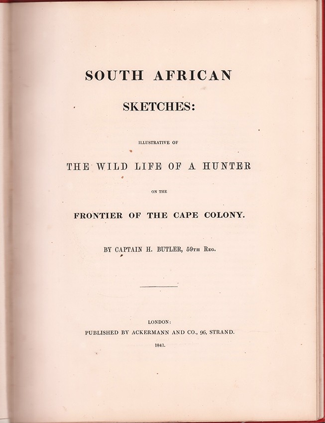 Edna Bradlow's article in the Standard Encyclopaedia of South Africa volume 2, page 628 – 9 refers: 'Though he served as an ensign in the 27th regiment on the eastern cape frontier (1835 -39) Henry Butler, an Irish officer appears in the Army List as Captain in the 59th Regiment. His volume of hand -coloured lithographs South African Sketches was published in 1841. In his preface he states that the object of his sketchbook was both to relieve the dreariness of two years' residence upon a 'barbarian frontier and to record the profusion of game which abounded on the Bontebok Flats near the Kat River Settlement. The letterpress and illustrations are of value in providing a full often amusing description of the topography, flora, fauna, climate and inhabitant of the region around present Fort Beaufort.