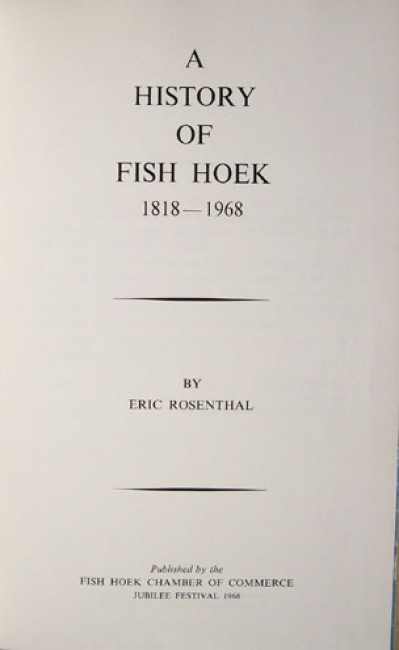 2)Rosenthal, Eric: \"A History of Fish Hoek 1818-1968.\" The text is in English. Original pale blue cloth boards with gilt titling and decoration on the upper board. 4 prelims, 68 pages, black and white photographic illustrations. Published by the Fish Hoek Chamber of Commerce, 1968. The binding has some scarring, but internally fresh and clean.