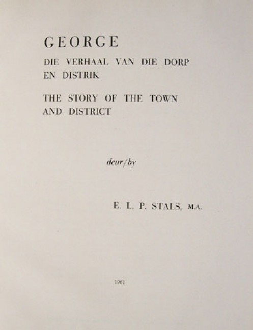3) Stals, E.L.P.: \"George - Die Verhaal van die Dorp en die Distrik - The Story of the Town and District.\" The text is fully bilingual, in both Afrikaans and English. Original navy blue simulated leather boards with gilt titling on the spine and the upper board. xiv prelims, 113 pages, coat of arms in full colour, black and white illustrations. Published by the George municipality and Divisional Council, 1961. This book is clean and in good condition.