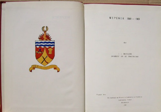 4) (Text in Afrikaans only) Oberholster, J.J.: \"Wepener 1869-1969.\" Original red simulated leather boards with gilt titling and the coat of arms on the upper board only.
