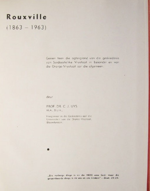 5) (Text in Afrikaans) Uys, Prof. Dr. C.J.: \"Rouxville (1863 -1963).\" Original red boards with black titling on the upper board. 170 pages, coat of arms in full colour, black and white illustrations, fold out map at the rear. This copy has a pen name, otherwise internally clean. The binding is a bit worn and soiled.