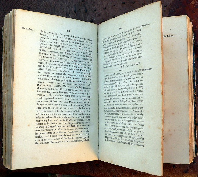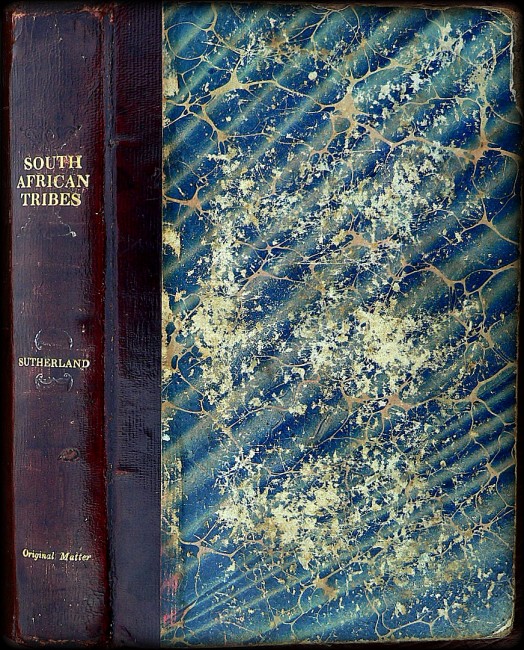 580pp. Quarter leather over marbled boards. Gilt to spine simply titled 'South African Tribes'. Two parts in one volume. Contains a seperate hand-written note addressed and presenting the book to Major Jardine, one of the first collectors of Africana in South Africa. Ex Libris (William Jardine - dated 1903) paste-down to front fixed EP.